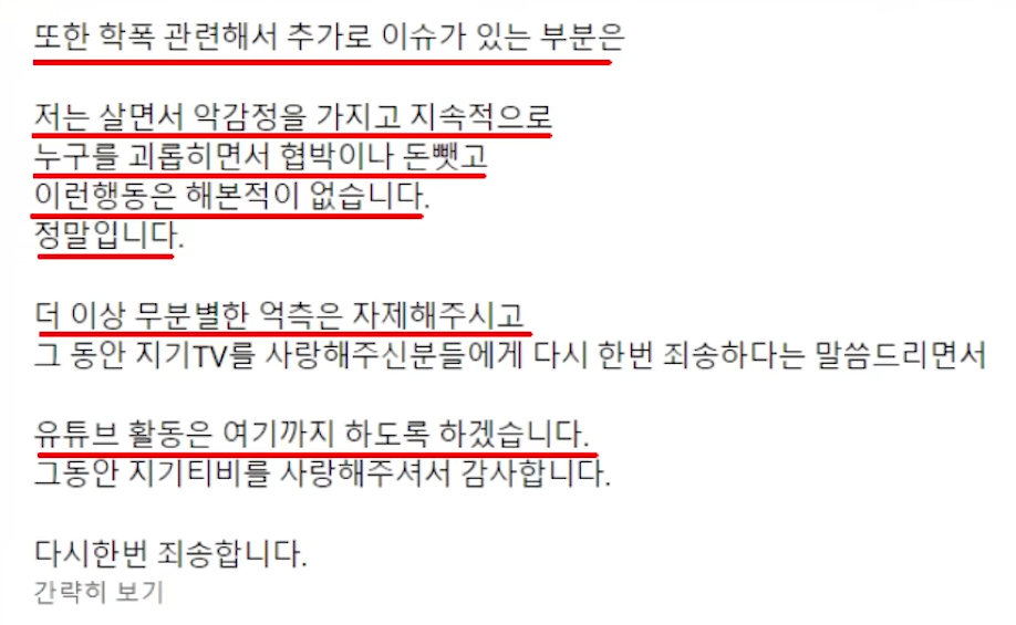 거기다 이 사과 영상은 양심적 자백이 아니라 디시에서 먼저 음주운전 사실이 나왔던 겁니다. 디시에서 화제가 되기 전에는'먹방에 빠진 지뚱이'라는 영상을 올리며 나 몰라라 했다는 겁니다.