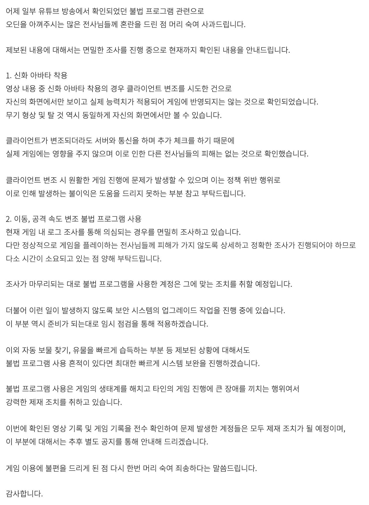 다만, 이동 및 공격 속도 변조 프로그램 부분은 게임 내 로그 조사를 통해 의심되는 상황을 먼저 조사하고 있는 상황이다. 카카오게임즈는 정상적으로 게임을 플레이하는 이용자에게 피해가 가지 않도록 조사하기 위해 시간이 소요되고 있다고 덧붙였다.