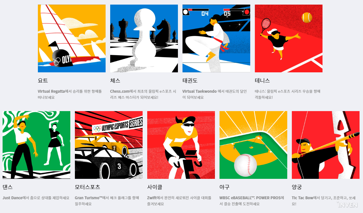 이번 올림픽 e스포츠 시리즈 종목은 댄스, 모터스포츠, 사이클, 야구, 양궁, 요트, 체스, 태권도, 테니스 이상 9개다. 태권도가 이번에 처음 추가됐다.
