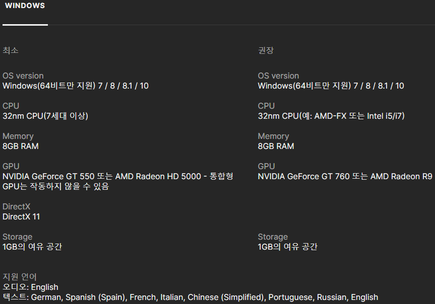 그래픽 카드 기준 GT 760, AMD 라데온 R9 급의 성능을 요구하니까요.