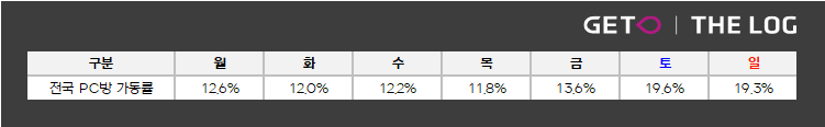 - PC방 게임 통계 서비스 더로그에 따른 금주 PC방 총 사용시간은 1,639만 시간으로 집계되었으며, 본격적인 새 학기 시작으로 인해 주간 PC방 사용시간이 감소세를 보였던 한 주였습니다. PC방 주간 가동률은 평일 평균 12.5%, 주말 평균 19.4%로 주간 평균 14.5%를 기록했습니다.