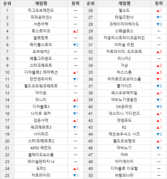 ◎ '로스트아크' 전주 대비 2계단 상승... 4위 탈환