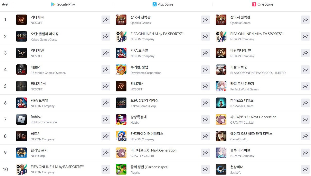 - 12일 기준 구글 플레이스토어 매출 순위에서는 이례적으로 서브컬쳐 게임이 10위권 내에 하나도 포함되지 않는 풍경을 연출했습니다. 대신 리니지M, 오딘 등 모바일 MMORPG가 견조한 매출 성적을 유지하고 있으며, 넥슨의 축구 게임 시리즈 '피파 모바일'과 '피파온라인 M'이 구글 매출 10위 내에 포함되는 모습을 확인 가능했습니다.