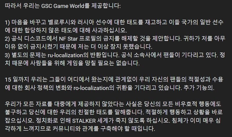 '스토커2'의 스토리, 컷씬 설명, 컨셉 아트, 글로벌 맵 등 수십 GB의 자료를 해킹했다고 밝힌 그들은 개발사인 GSC 게임 월드에 세 가지를 요구하고 있다. 첫 번째는 벨라루스와 러시아 플레이어들에 대한 태도 재고 및 그간의 합당하지 않은 태도에 대한 사과다. 두 번째로는 공식 디스코드에서 아무 이유 없이 밴시킨 NF Star 프로필의 밴 해제를 요구했으며, 끝으로 러시아의 많은 팬들이 기다리고 있다면서 '러시아 현지화'를 되돌리도록 요구 아닌 요구를 하는 중이다.