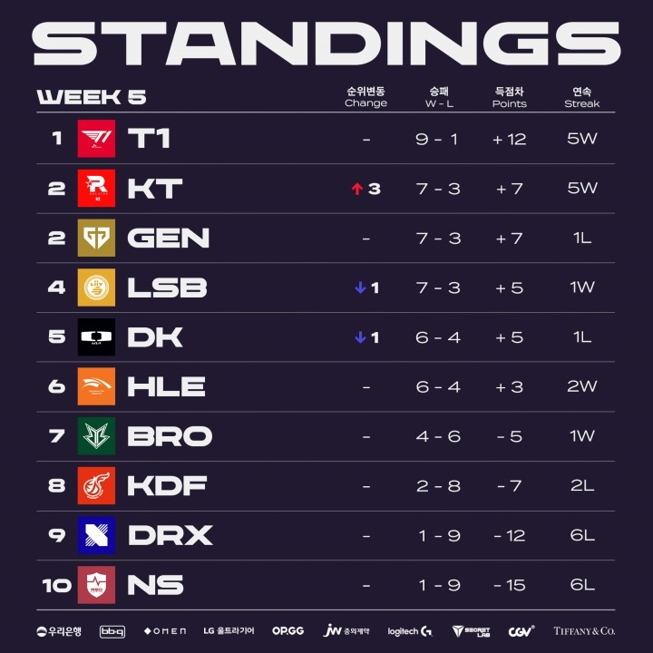 2023 LCK 스프링 5주 차 팀 순위(제공=LCK).