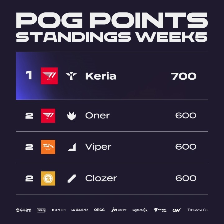 세트에서 가장 빼어난 플레이를 펼친 선수에게 주어지는 플레이어 오브 더 게임(Player Of the Game;POG) 순위도 매주 선두가 바뀌고 있다. 4주차에서 600 포인트에 도달하면서 1위에 올랐던 T1의 정글러 '오너' 문현준이 5주차에서는 공동 2위로 내려왔다. 같은 팀의 서포터인 '케리아' 류민석이 리브 샌드박스와의 대결에서 2, 3세트 모두 POG로 선정되면서 700 포인트 고지에 올랐기 때문.