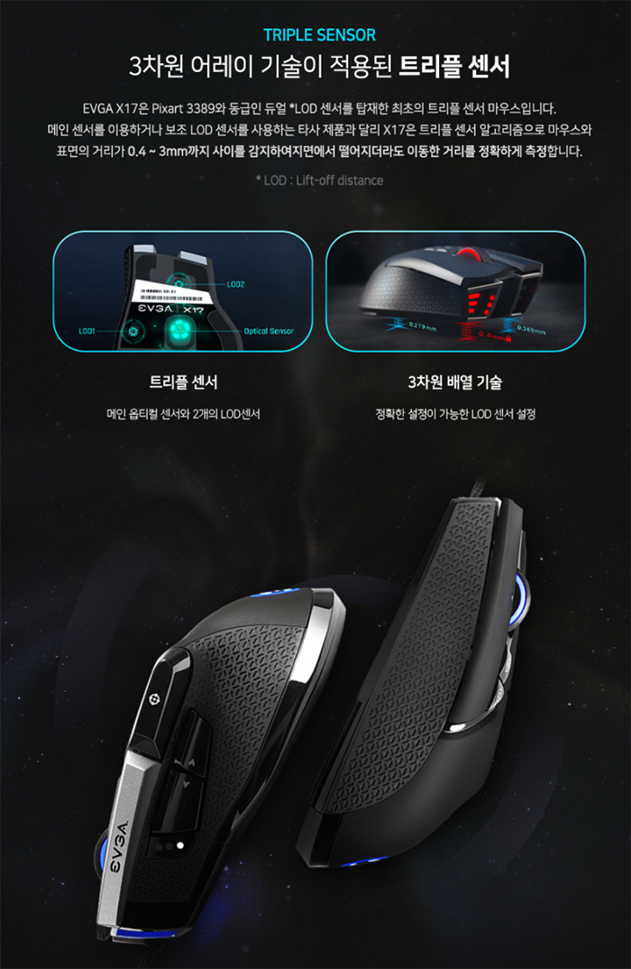 EVGA X17 게이밍 마우스(블랙)는 PIXART사의 PMW 3389 센서를 탑재, 최대 16,000 DPI 와 400 IPS, 50G의 가속도, 최대 8,000 Hz의 폴링레이트를 갖춘 고성능의 게이밍 마우스이다. 메인 센서인 LOD(lift of distance) 센서와 추가로 2개의 보조 센서, 총 3개로 이루어져 최소 0.4mm부터 3mm까지 움직임 거리를 자동적으로 판단, 게이머의 움직임에 빠르고 정확하게 움직여준다. DPI를 손쉽게 낮추는 스나이퍼 버튼 외 10개의 버튼을 통해 편리하게 사용이 가능하다.