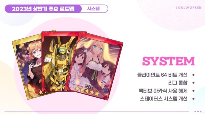 우선 '소울워커'가 6개월 내에 64비트로 개선된다. 그동안 '소울워커'는 엔진 문제로 32비트 밖에 지원되지 않아 콘텐츠 확장에 한계가 있었지만, 오랜 노력 끝에 64비트화에 성공한 것으로 알려졌다. 박경배 PD는 "64비트가 되면 새로운 재미를 줄 수 있는 콘텐츠가 많이 나올 수 있을 것"이라고 설명했다.