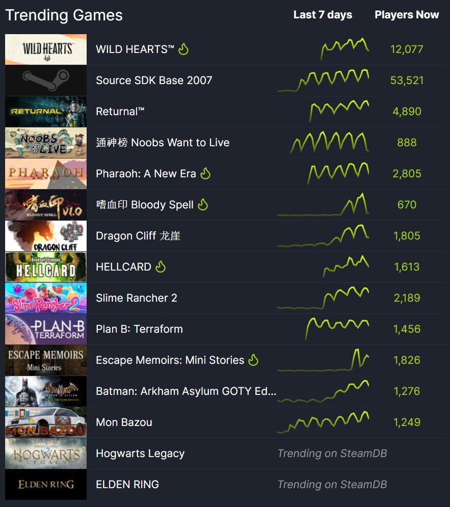 - 금주 스팀DB 기준 트렌드 페이지 상단에 위치한 게임은 EA의 신작 수렵 액션 게임 '와일드 하츠'가 선정됐습니다. '케모노'라 불리는 여러 괴수와 맞서 싸우는 주인공을 그리는 액션 게임으로, 무쌍 시리즈로 유명한 개발사 오메가포스와 EA가 협업해 탄생시킨 작품이기도 합니다. 플레이어는 '카라쿠리'라고 불리는 시스템을 이용, 지형과 사물을 전략적으로 활용하면서 자신보다 거대한 괴물을 상대해 나가게 됩니다.