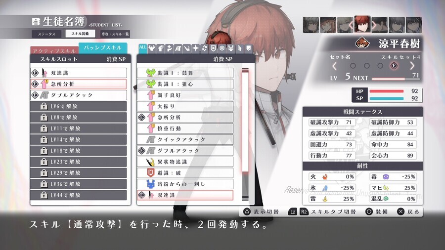 수업에서 스킬을 익히면 전투 전 캐릭터에 장비할 수 있는데 장비 수에 상한이 있으므로 싸우는 상대에 맞게 취사 선택이 필요하다. 스킬은 액티브 스킬과 패시브 스킬을 합쳐 약 300종에 달하며, 스킬 장비 수의 상한은 생도의 성장에 따라 증가한다.