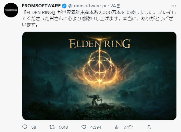 프롬 소프트웨어는 금일(22일), 공식 SNS를 통해 엘든 링(ELDEN RING)의 전세계 누적 출하량 2천만 장 돌파 소식을 전했다. 플레이해주신 모든 유저 여러분에게 마음 깊이 감사한다는 인사말도 함께였다. 엘든 링 공식 SNS에서도 '여러분의 지지와 동행에 진심으로 감사드립니다'라는 짧은 인사말이 함께 전해졌다.