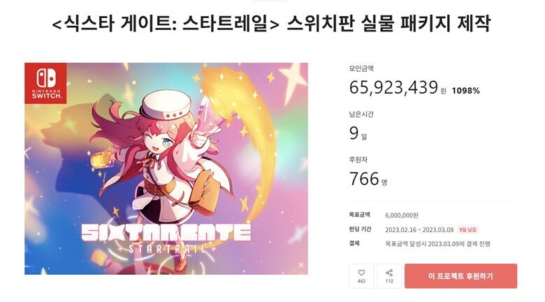 '식스타 게이트: 스타트레일'의 펀딩이 목표금액 600만원의 1,000%를 돌파하여 6,500만 원이 넘는 모금에 성공했다.